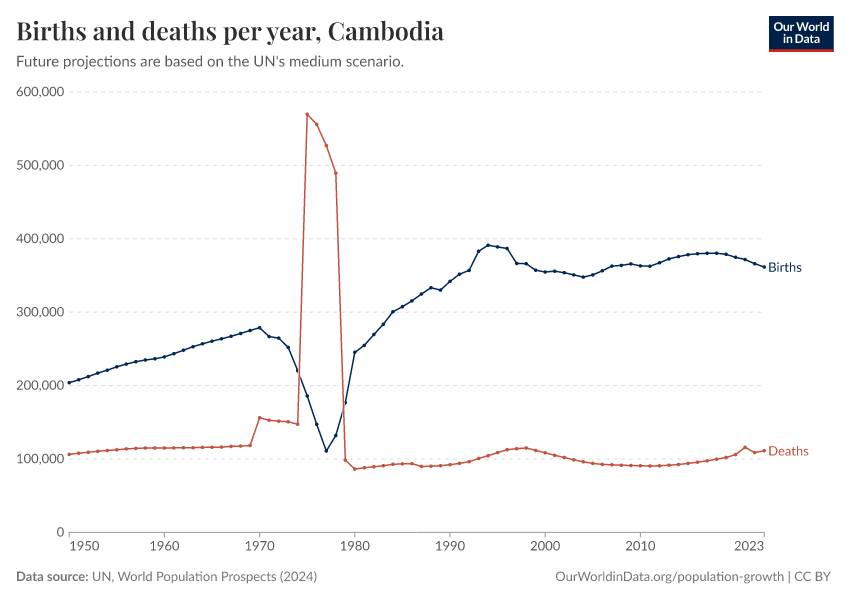 The chart below shows how births and deaths in Cambodia have changed over time.