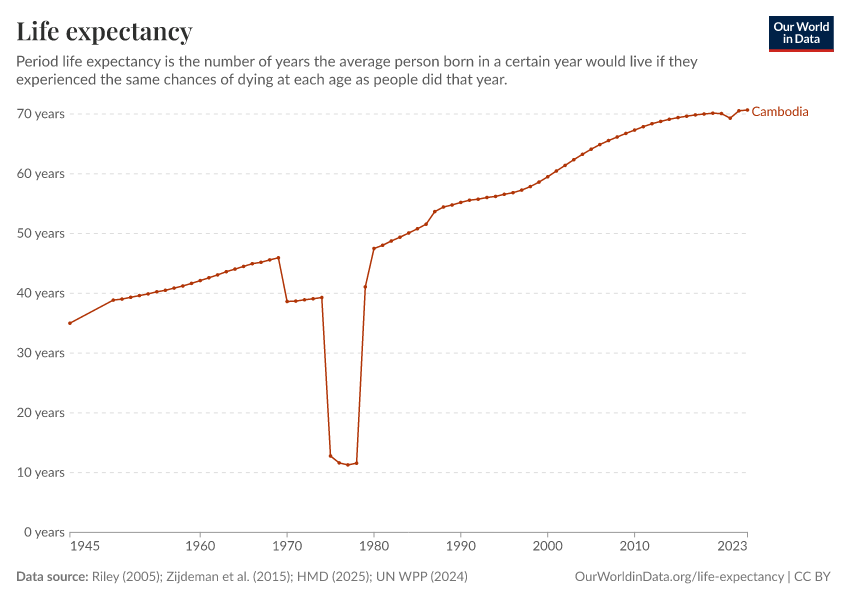 In 2023, Cambodia’s life expectancy at birth was 70.7 years.