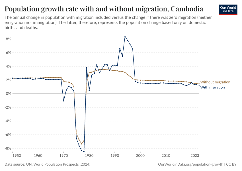 In the chart, you can see Cambodia’s population change with migration, next to a scenario where migration was zero. In this case, population changes would only be determined by births and deaths.