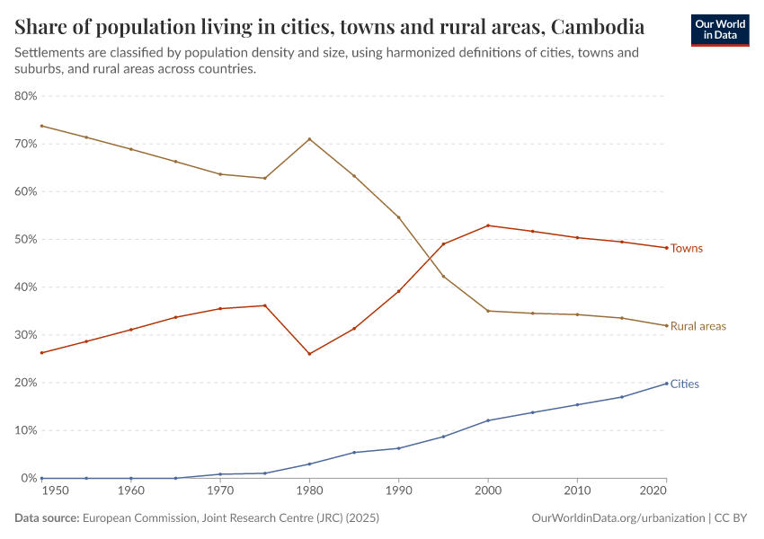 In the chart, you can see how the share of people in Cambodia who live in rural areas, towns, and cities has changed over time.