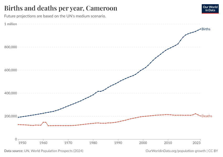 The chart below shows how births and deaths in Cameroon have changed over time.