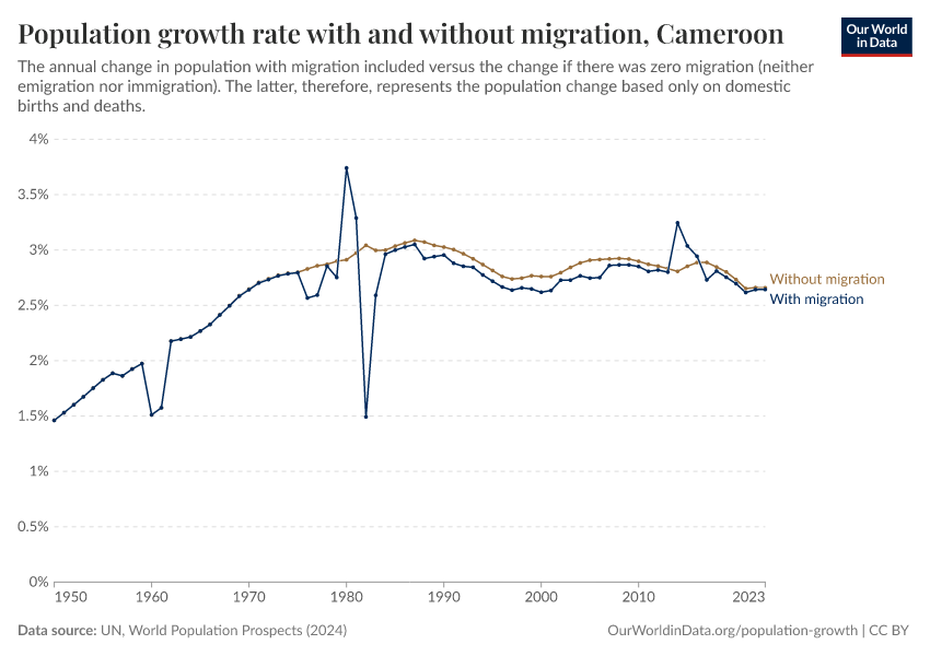 In the chart, you can see Cameroon’s population change with migration, next to a scenario where migration was zero. In this case, population changes would only be determined by births and deaths.