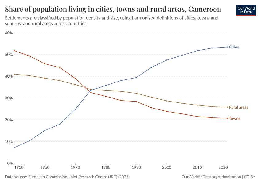 In the chart, you can see how the share of people in Cameroon who live in rural areas, towns, and cities has changed over time.