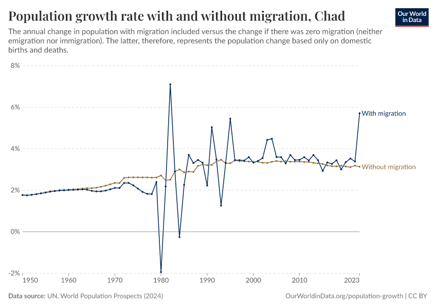 In the chart, you can see Chad’s population change with migration, next to a scenario where migration was zero. In this case, population changes would only be determined by births and deaths.