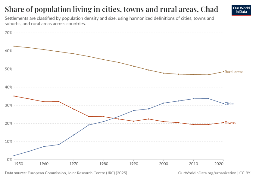 In the chart, you can see how the share of people in Chad who live in rural areas, towns, and cities has changed over time.
