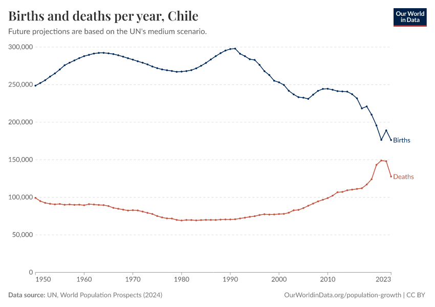 The chart below shows how births and deaths in Chile have changed over time.