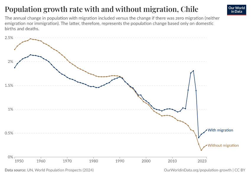 In the chart, you can see Chile’s population change with migration, next to a scenario where migration was zero. In this case, population changes would only be determined by births and deaths.
