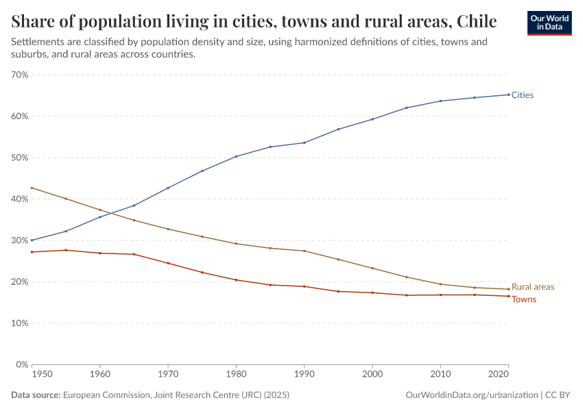 In the chart, you can see how the share of people in Chile who live in rural areas, towns, and cities has changed over time.