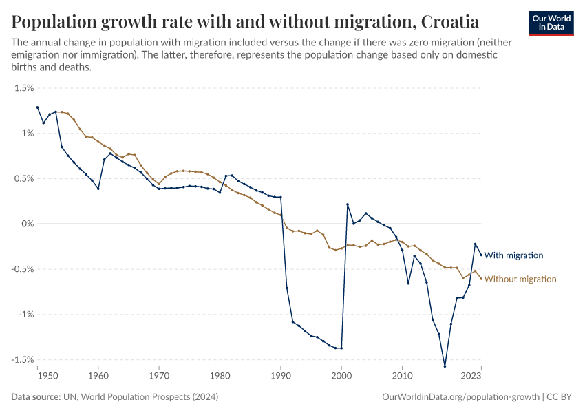 In the chart, you can see Croatia’s population change with migration, next to a scenario where migration was zero. In this case, population changes would only be determined by births and deaths.