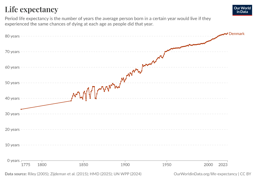 In 2023, Denmark’s life expectancy at birth was 81.9 years.