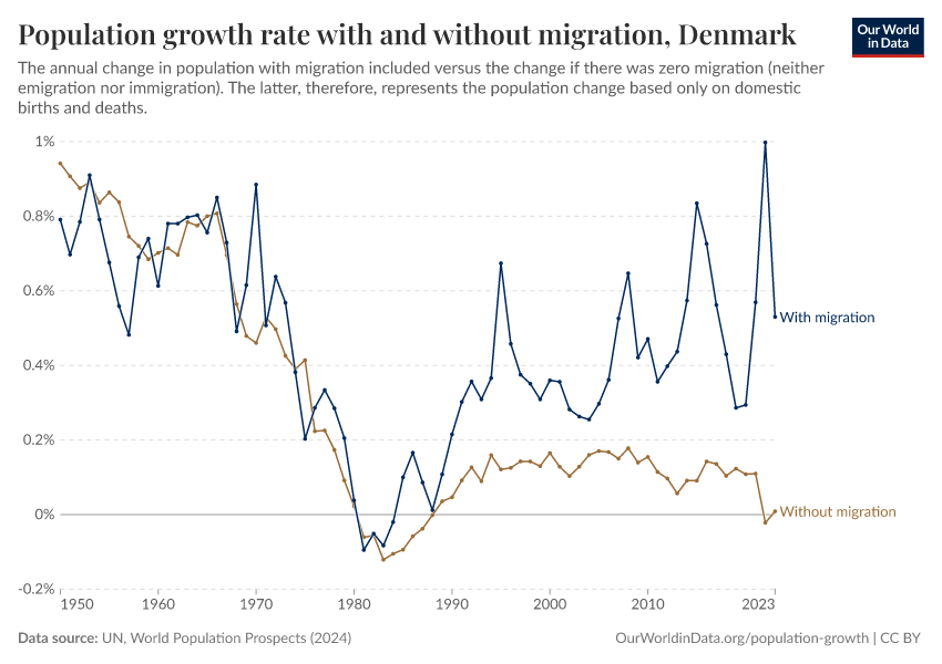 In the chart, you can see Denmark’s population change with migration, next to a scenario where migration was zero. In this case, population changes would only be determined by births and deaths.