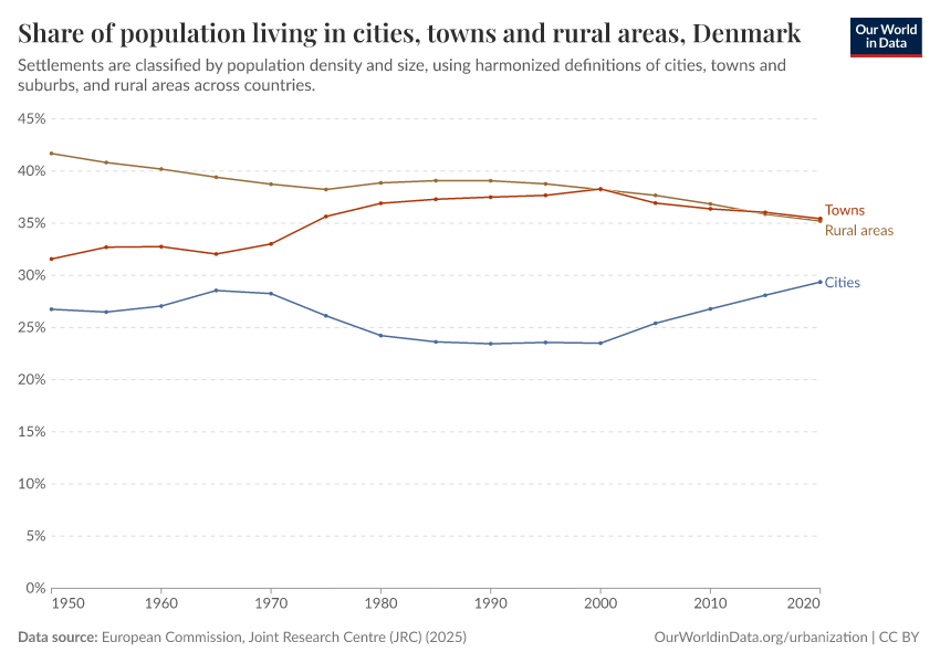 In the chart, you can see how the share of people in Denmark who live in rural areas, towns, and cities has changed over time.