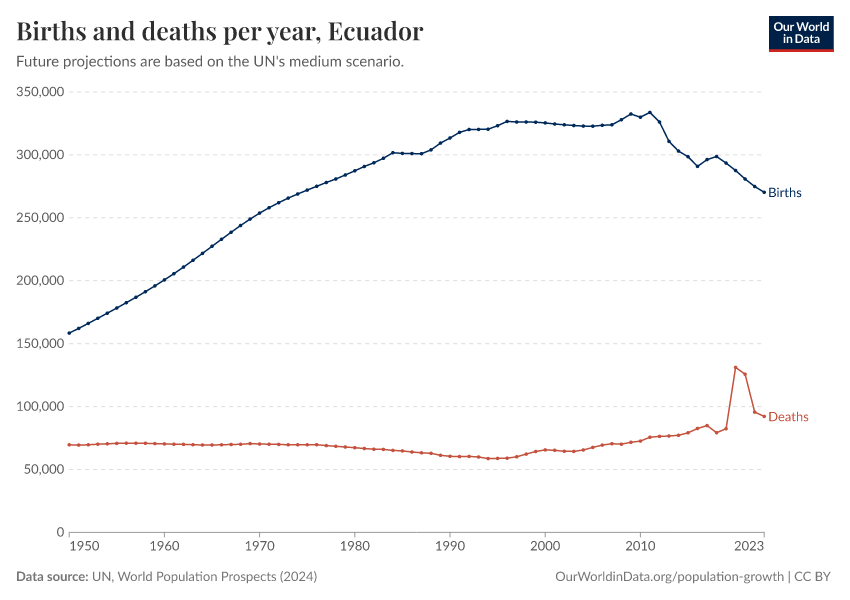 The chart below shows how births and deaths in Ecuador have changed over time.