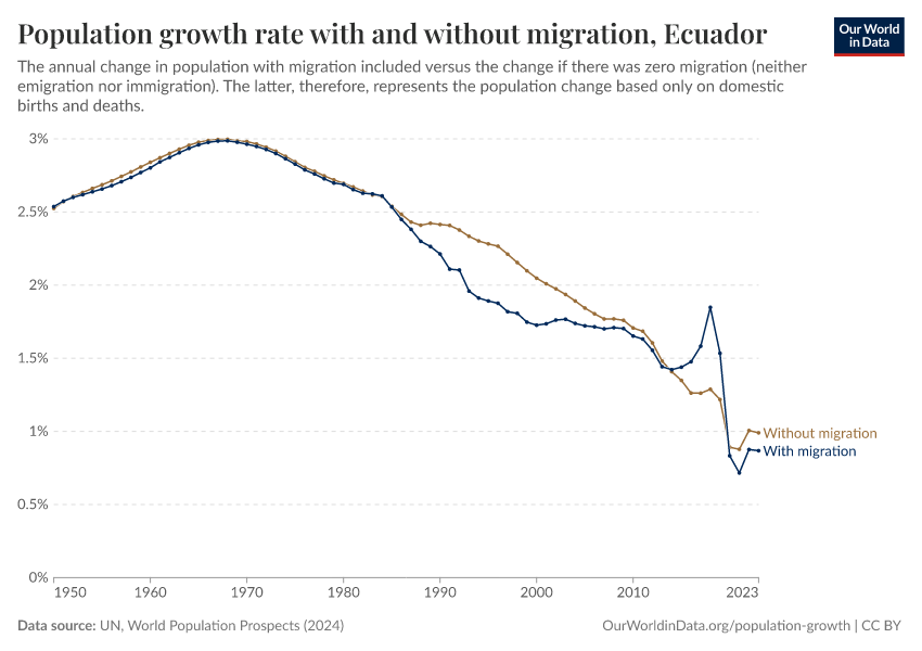 In the chart, you can see Ecuador’s population change with migration, next to a scenario where migration was zero. In this case, population changes would only be determined by births and deaths.