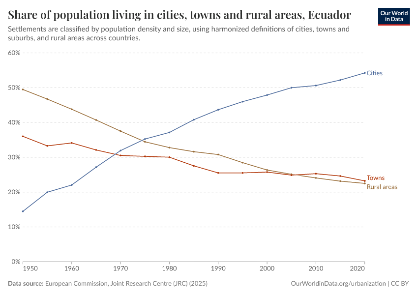 In the chart, you can see how the share of people in Ecuador who live in rural areas, towns, and cities has changed over time.