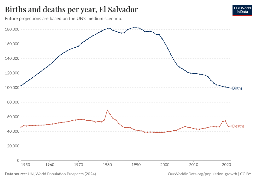 The chart below shows how births and deaths in El Salvador have changed over time.