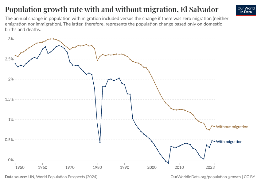 In the chart, you can see El Salvador’s population change with migration, next to a scenario where migration was zero. In this case, population changes would only be determined by births and deaths.