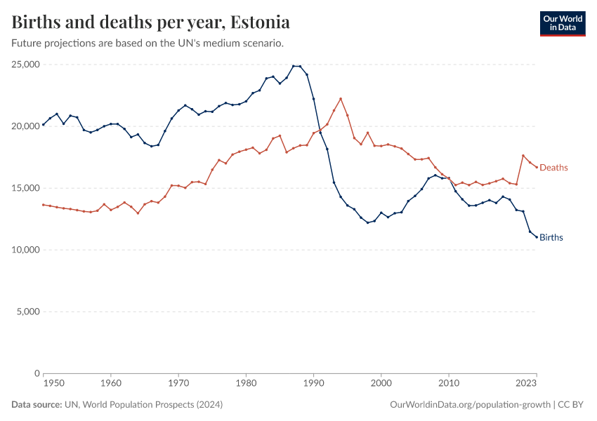 The chart below shows how births and deaths in Estonia have changed over time.