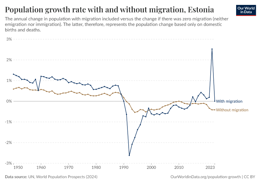 In the chart, you can see Estonia’s population change with migration, next to a scenario where migration was zero. In this case, population changes would only be determined by births and deaths.
