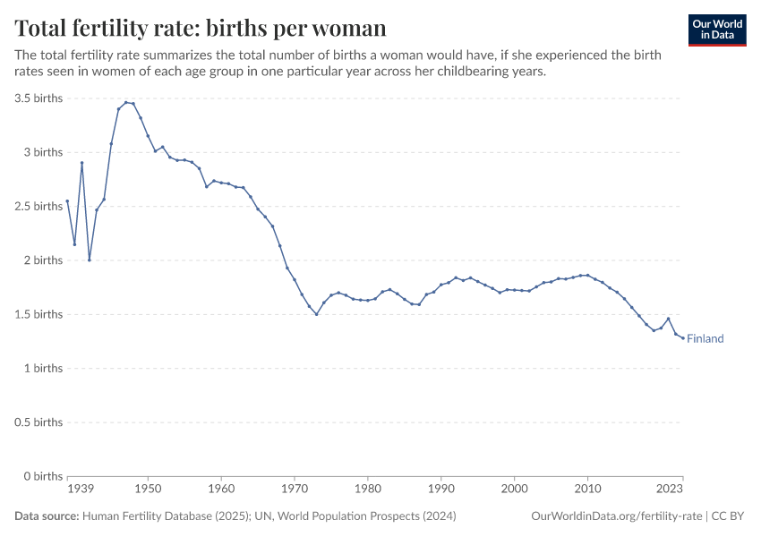 In 2023, Finland’s total fertility rate was 1.28 births per woman.