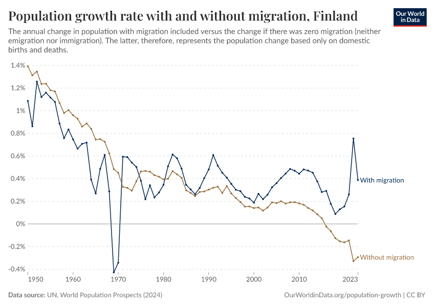 Is Finland’s population growing or shrinking, and how quickly? The population growth rate tells us this.