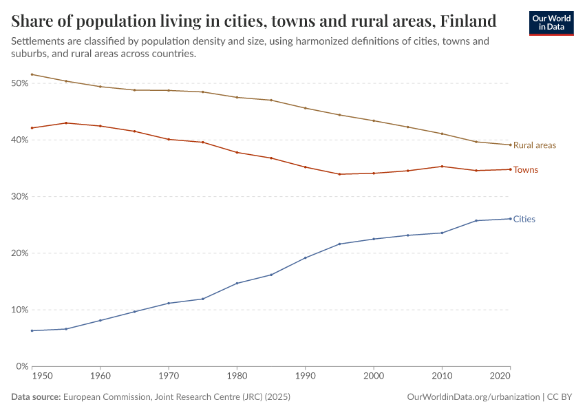 In the chart, you can see how the share of people in Finland who live in rural areas, towns, and cities has changed over time.