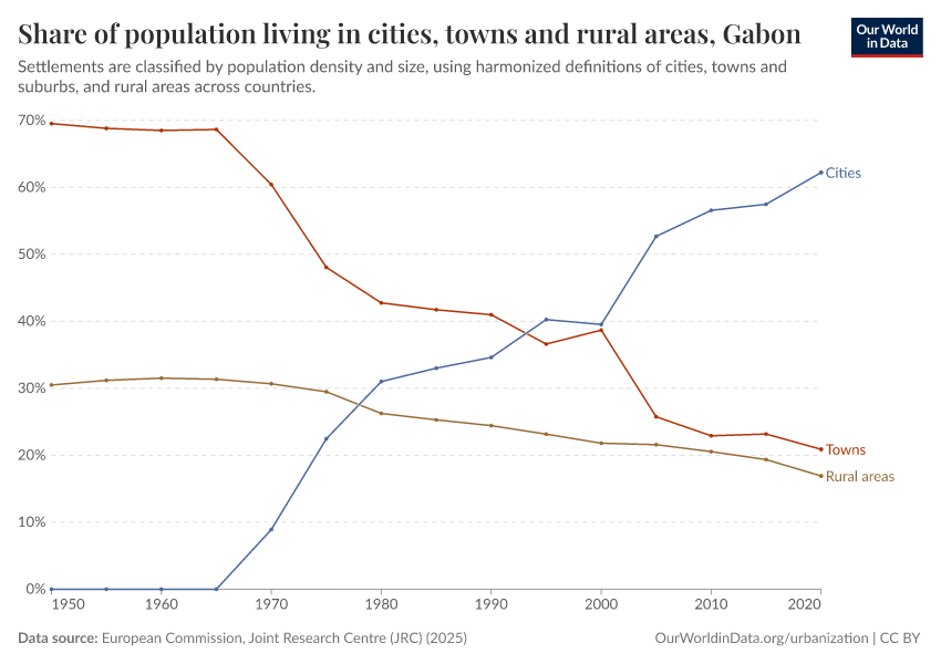 In the chart, you can see how the share of people in Gabon who live in rural areas, towns, and cities has changed over time.