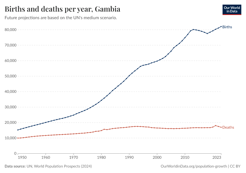 The chart below shows how births and deaths in the Gambia have changed over time.