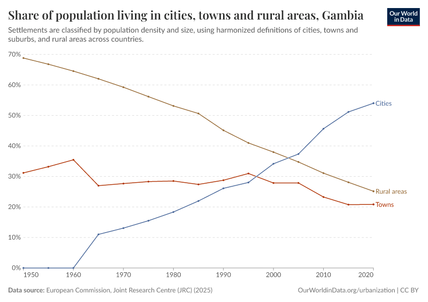 In the chart, you can see how the share of people in the Gambia who live in rural areas, towns, and cities has changed over time.