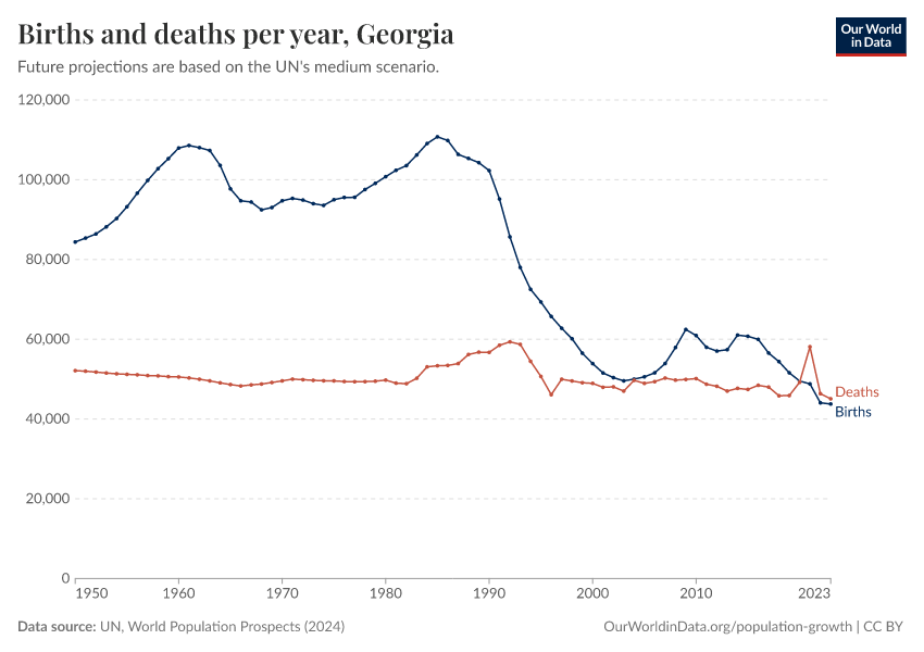 The chart below shows how births and deaths in Georgia have changed over time.