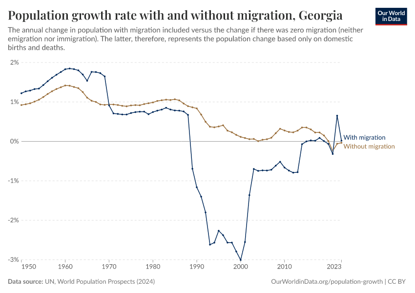 In the chart, you can see Georgia’s population change with migration, next to a scenario where migration was zero. In this case, population changes would only be determined by births and deaths.