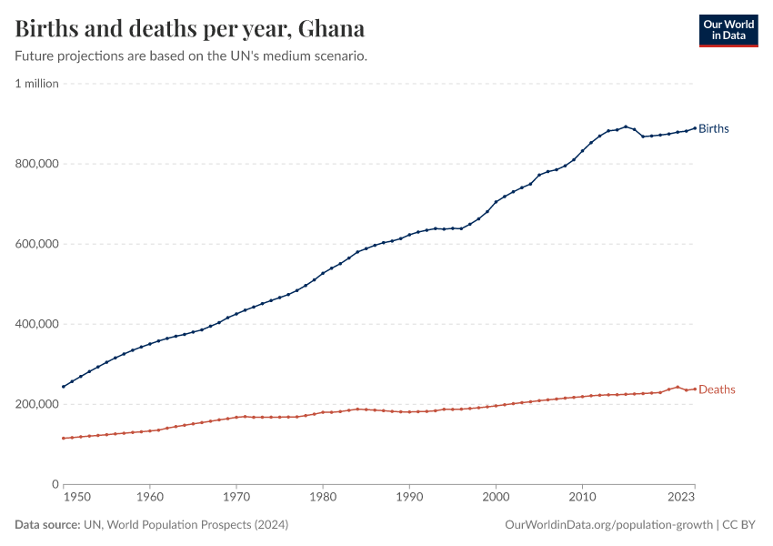 The chart below shows how births and deaths in Ghana have changed over time.