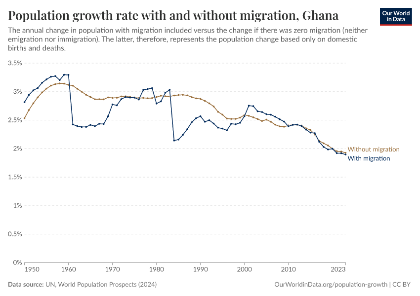In the chart, you can see Ghana’s population change with migration, next to a scenario where migration was zero. In this case, population changes would only be determined by births and deaths.