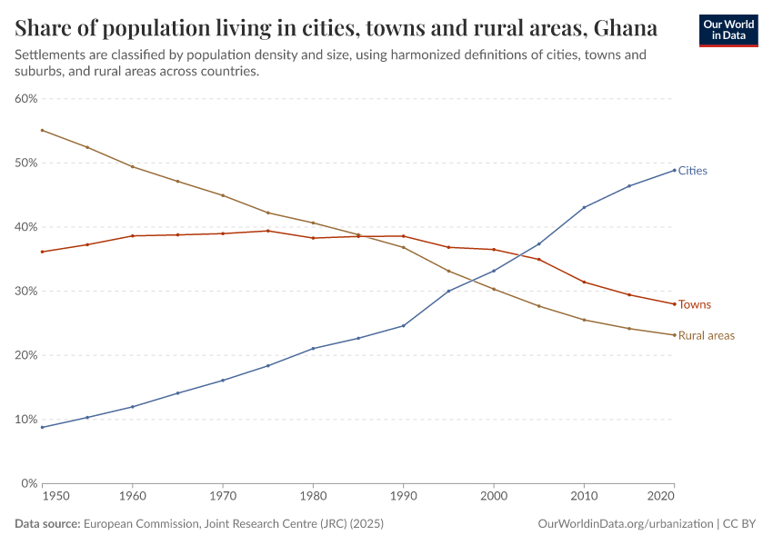 In the chart, you can see how the share of people in Ghana who live in rural areas, towns, and cities has changed over time.