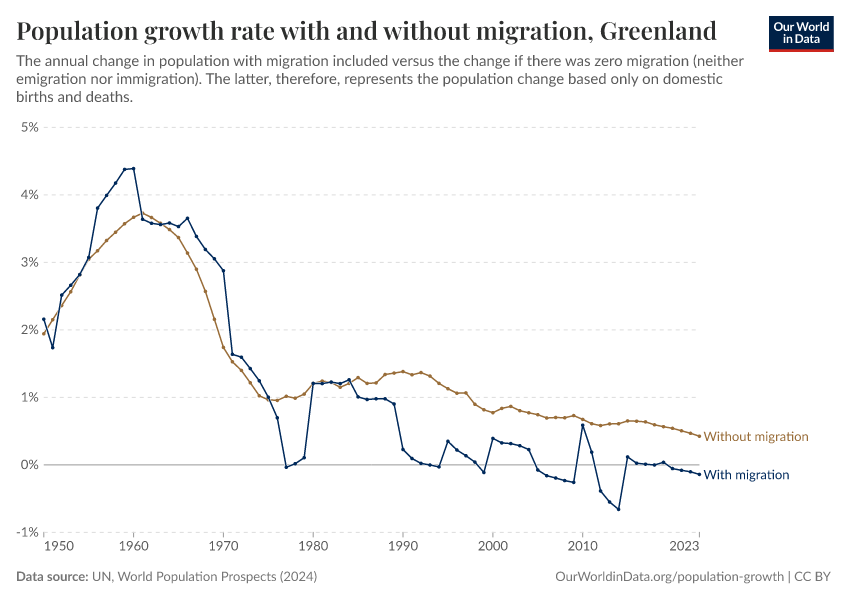 Is Greenland’s population growing or shrinking, and how quickly? The population growth rate tells us this.