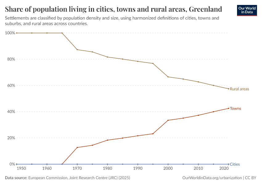 In the chart, you can see how the share of people in Greenland who live in rural areas, towns, and cities has changed over time.