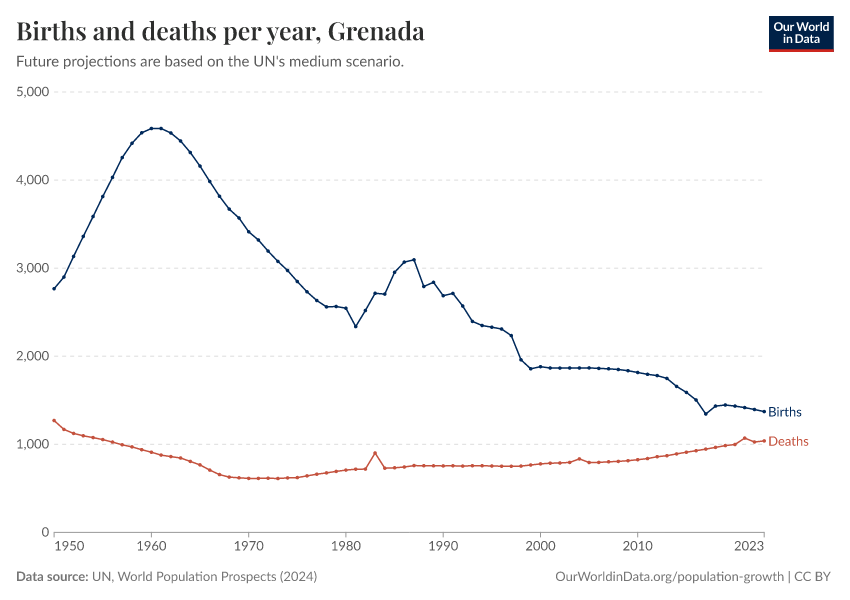 The chart below shows how births and deaths in Grenada have changed over time.