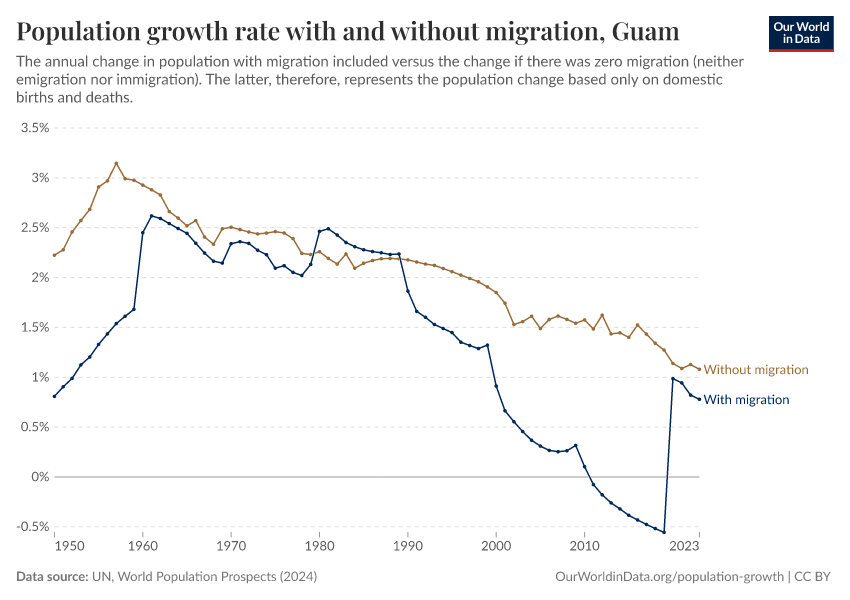 In the chart, you can see Guam’s population change with migration, next to a scenario where migration was zero. In this case, population changes would only be determined by births and deaths.