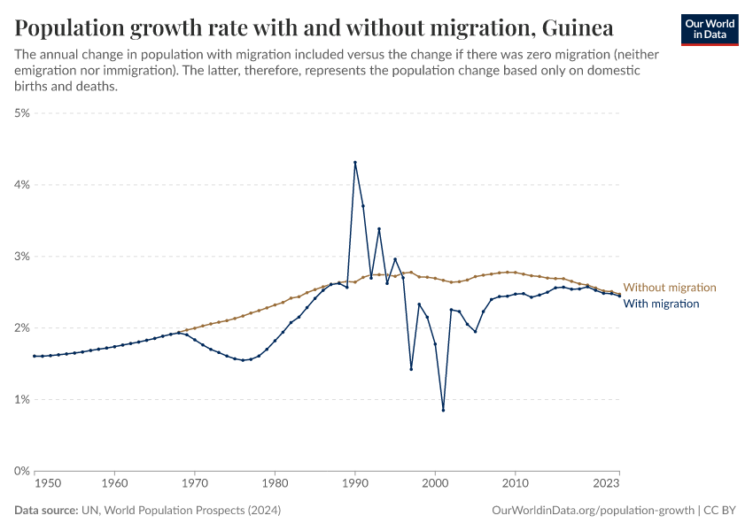 In the chart, you can see Guinea’s population change with migration, next to a scenario where migration was zero. In this case, population changes would only be determined by births and deaths.