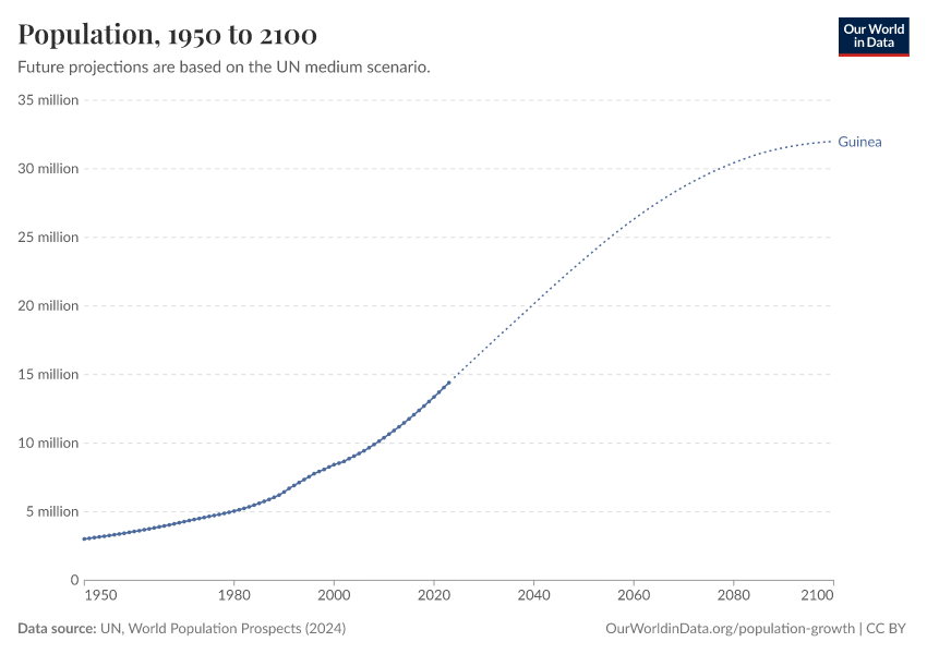 In the chart, you can see its latest medium projection through to the end of the century. In 2023, Guinea’s population was 14.41 million. By 2100, it is projected to be 32.01 million.