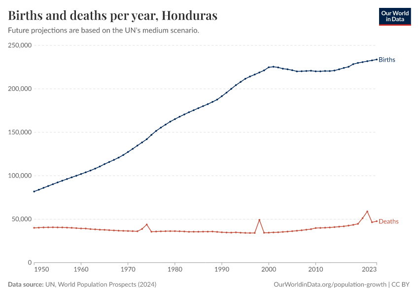 The chart below shows how births and deaths in Honduras have changed over time.