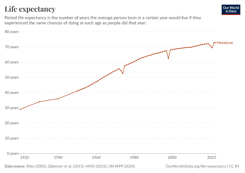 In 2023, Honduras’ life expectancy at birth was 72.9 years.