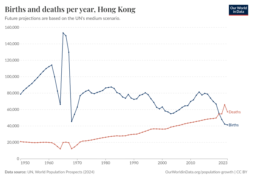 The chart below shows how births and deaths in Hong Kong have changed over time.
