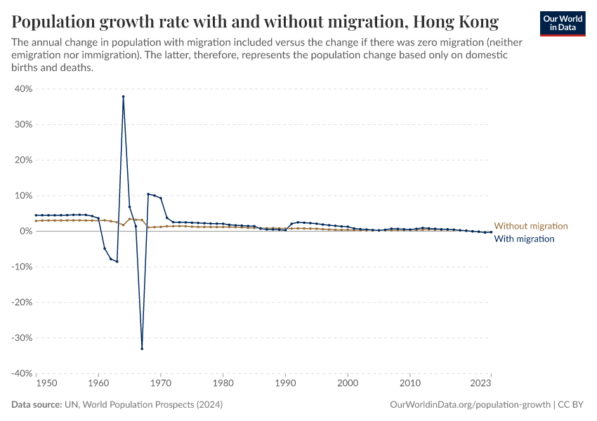 In the chart, you can see Hong Kong’s population change with migration, next to a scenario where migration was zero. In this case, population changes would only be determined by births and deaths.