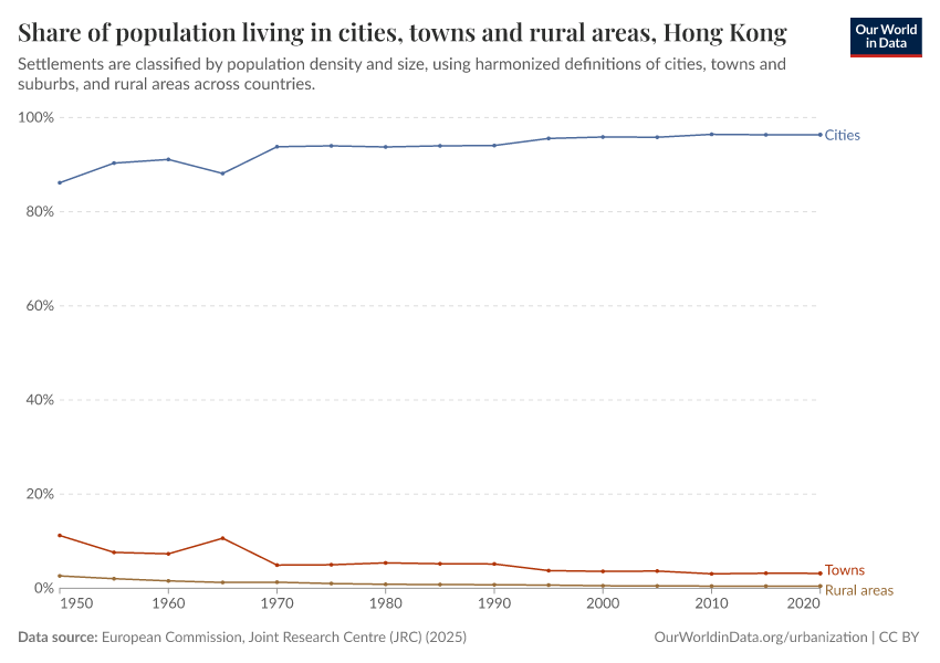 In the chart, you can see how the share of people in Hong Kong who live in rural areas, towns, and cities has changed over time.