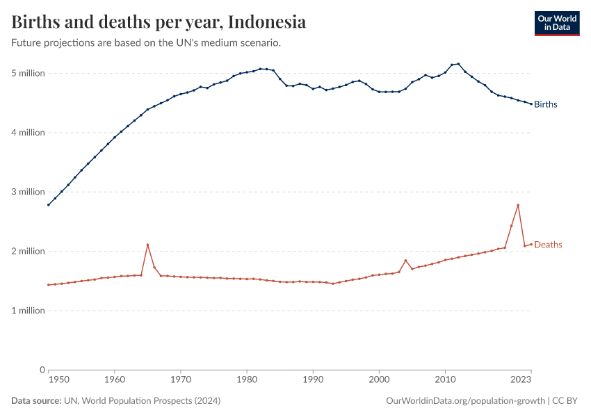 The chart below shows how births and deaths in Indonesia have changed over time.