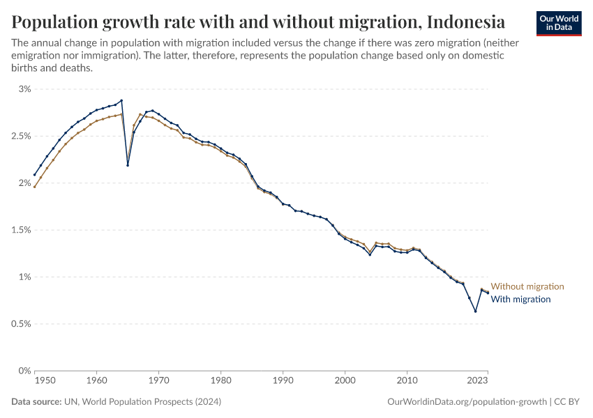In the chart, you can see Indonesia’s population change with migration, next to a scenario where migration was zero. In this case, population changes would only be determined by births and deaths.