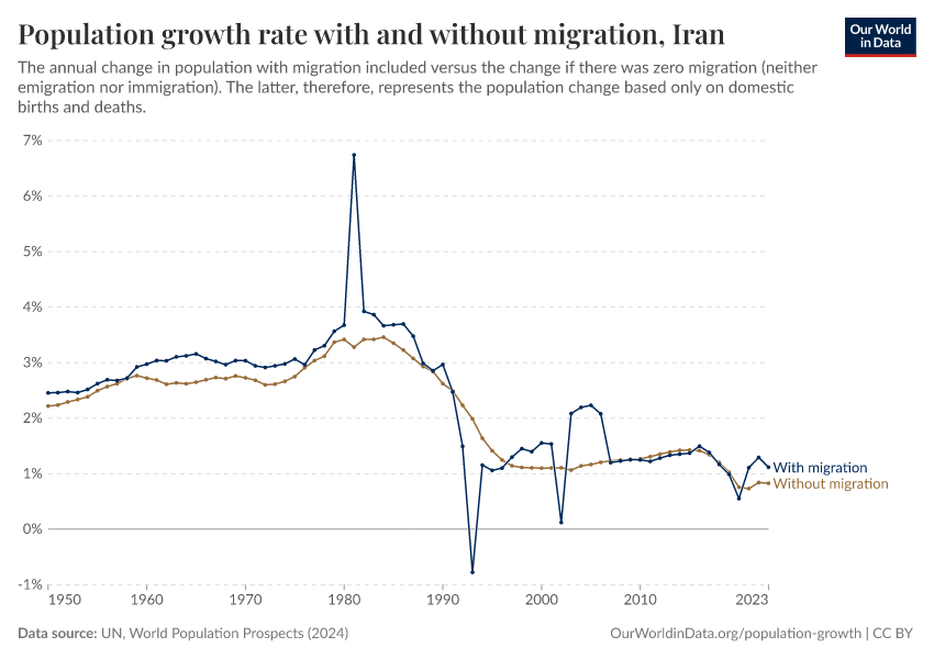 In the chart, you can see Iran’s population change with migration, next to a scenario where migration was zero. In this case, population changes would only be determined by births and deaths.