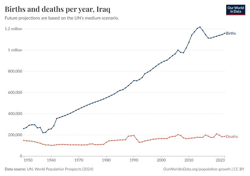 The chart below shows how births and deaths in Iraq have changed over time.