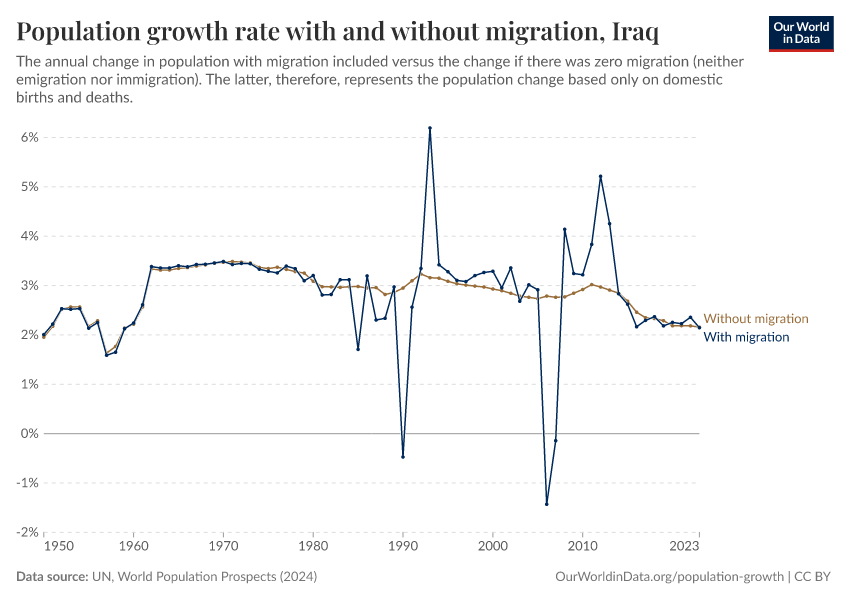 In the chart, you can see Iraq’s population change with migration, next to a scenario where migration was zero. In this case, population changes would only be determined by births and deaths.